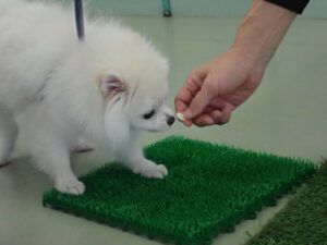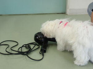 今回は、ドライヤーと人工芝と診察台を使いました。